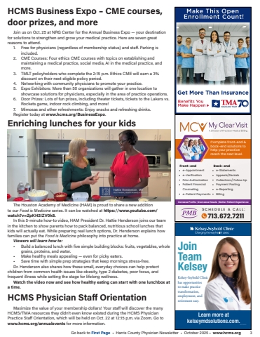 Go back to First Page %u2022 Harris County Physician Newsletter %u2022 October 2025 %u2022 www.hcms.org 3 Increase Profits | Decrease Hassle | Better Patient Experience713.672.7211S C H E D U L E A C A L L :Complete front-end &back-end solutions tohelp your practicereach the next level.Front-end Back-ende-Appointmente-VerificationPrior AuthorizationPatient FinancialCounselinge-Patient Paymentse-StatementsAppeals/DenialsCollections/ Follow UpPayment Postinge-ReportingBillingJoinTeamKelseyKelsey-Seybold Clinic has opportunities to make practice transformation, employment, and retirement easy.Learn more atkelseymdsolutions.com.964244419Enriching lunches for your kidsThe Houston Academy of Medicine (HAM) is proud to share a new addition to our%u00a0Food is Medicine%u00a0series. It can be watched at https://www.youtube.com/watch?v=ZpKH2IZV0k8.In this 5-minute how-to video, HAM President Dr. Hattie Henderson joins our team in the kitchen to show parents how to pack balanced, nutritious school lunches that kids will actually eat. While preparing real lunch options, Dr. Henderson explains how families can put the%u00a0Food is Medicine%u00a0philosophy into practice at home.Viewers will learn how to:%u2022 Build a balanced lunch with five simple building blocks: fruits, vegetables, whole grains, proteins, and water.%u2022 Make healthy meals appealing %u2014 even for picky eaters.%u2022 Save time with simple prep strategies that keep mornings stress-free.Dr. Henderson also shares how these small, everyday choices can help protect children from common health issues like obesity, type 2 diabetes, poor focus, and frequent illness while setting the stage for lifelong wellness.Watch the video now and see how healthy eating can start with one lunchbox at a time. HCMS Physician Staff Orientation Maximize the value of your membership dollars! Your staff will discover the many HCMS/TMA resources they didn%u2019t even know existed during the HCMS Physician Practice Staff Orientation, which will be held on Oct. 22 at 12:15 p.m. via Zoom. Go to www.hcms.org/annualevents for more information.HCMS Business Expo %u2013 CME courses, door prizes, and moreJoin us on Oct. 25 at NRG Center for the Annual Business Expo %u2014 your destination for solutions to strengthen and grow your medical practice. Here are seven great reasons to attend.1. Free for physicians (regardless of membership status) and staff. Parking is included. 2. CME Courses: Four ethics CME courses with topics on establishing and maintaining a medical practice, social media, AI in the medical practice, and more.3. TMLT policyholders who complete the 2:15 p.m. Ethics CME will earn a 3% discount on their next eligible policy period.4. Networking with community physicians to promote your practice.5. Expo Exhibitors: More than 50 organizations will gather in one location to showcase solutions for physicians, especially in the area of practice operations.6. Door Prizes: Lots of fun prizes, including theater tickets, tickets to the Lakers vs. Rockets game, indoor rock climbing, and more! 7. Mimosas and other refreshments: Enjoy snacks and refreshing drinks.Register today at www.hcms.org/BusinessExpo.