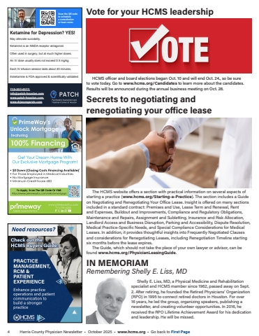 4 Harris County Physician Newsletter %u2022 October 2025 %u2022 www.hcms.org %u2022 Go back to First PageKetamine is an NMDA receptor antagonist.Ketamine for Depression? YES!May alleviate suicidality.Often used in surgery, but at much higher doses.An IV dose usually does not exceed 0.5 mg/kg.Each IV infusion session lasts about 40 minutes.Esketamine is FDA-approved & scientifically validated.713-337-0177 info@patch-houston.comwww.patch-houston.com www.drjasongarvin.comScan the QR code to schedule a consultationor learn more.IN MEMORIAMRemembering Shelly E. Liss, MDShelly E. Liss, MD, a Physical Medicine and Rehabilitation specialist and HCMS member since 1962, passed away on Sept. 2. After retiring, he founded the Retired Physicians%u2019 Organization (RPO) in 1995 to connect retired doctors in Houston. For over 16 years, he led the group, organizing speakers, publishing a newsletter, and creating volunteer opportunities. In 2016, he received the RPO Lifetime Achievement Award for his dedication and leadership. He will be missed.Secrets to negotiating and renegotiating your office leaseThe HCMS website offers a section with practical information on several aspects of starting a practice (www.hcms.org/Starting-a-Practice). The section includes a Guide on Negotiating and Renegotiating Your Office Lease. Insight is offered on many sections included in a standard contract: Premises and Use, Lease Term and Renewal, Rent and Expenses, Buildout and Improvements, Compliance and Regulatory Obligations, Maintenance and Repairs, Assignment and Subletting, Insurance and Risk Allocation, Landlord Access and Business Disruption, Parking and Accessibility, Dispute Resolution, Medical Practice-Specific Needs, and Special Compliance Considerations for Medical Leases. In addition, it provides thoughtful insights into Frequently Negotiated Clauses and considerations for Renegotiating Leases, including Renegotiation Timeline starting six months before the lease expires. The Guide, which should not take the place of your own lawyer or advisor, can be found www.hcms.org/PhysicianLeasingGuide. Vote for your HCMS leadershipHCMS officer and board elections began Oct. 10 and will end Oct. 24., so be sure to vote today. Go to www.hcms.org/Candidates to learn more about the candidates. Results will be announced during the annual business meeting on Oct. 28.